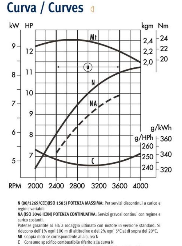 Giri/min 3000 3600 4000 Potenza (kW/HP)*curve potenza N (80/1269/CEE)ISO 1585 (kW/CV) 7.4/10.0 8.1/11.0 8.3/11.3 NA ISO 3046/1 ICXN /kw/CV) 6.6/9.0 7.4/10.0 - Coppia massima (Nm@giri/min) 23.7 / 2.42 Cons. spec. min. (g/kWh) 342
