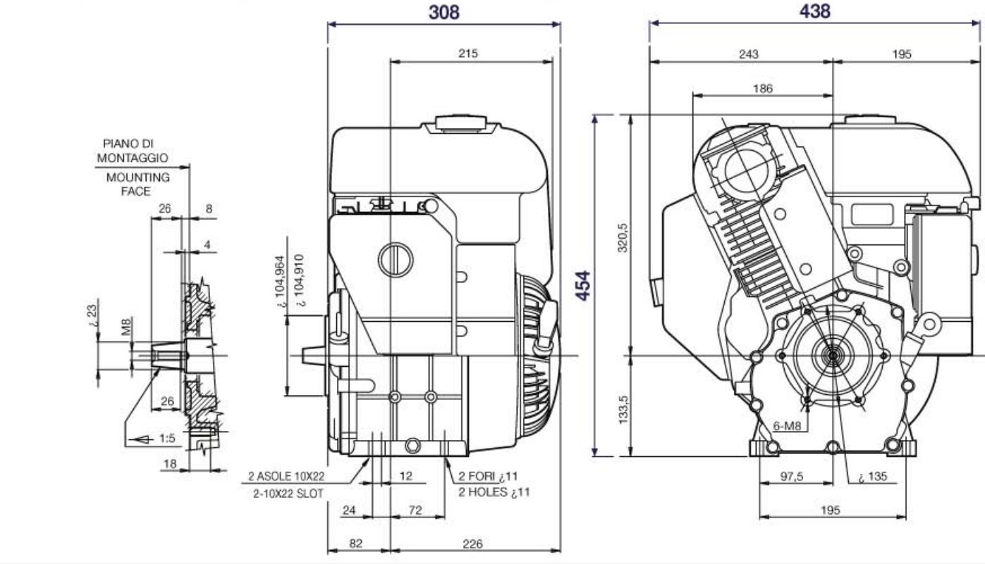 A × L × P (ventola esclusa) (mm) 454x438x308 Peso a secco (kg) 31 Capacità Serbatoio (l) 6.0 Capacità Coppa Olio (l) 1.2 Massima inclinazione ammissibile